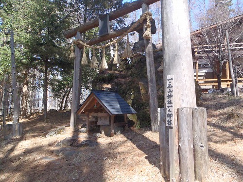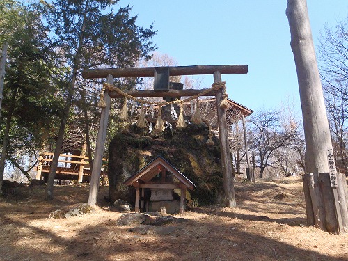 神社といっても祀られているのは巨大な石。手前に小さな祠があります。もともとあった石なのか、ここまで運んだものなのか定かではありません。由来も調べてみましたがよくわかりません。この近辺には武田信玄の棒道が通っているので、この石は目印の役割を果たしていたのではないかという説があるそうです。